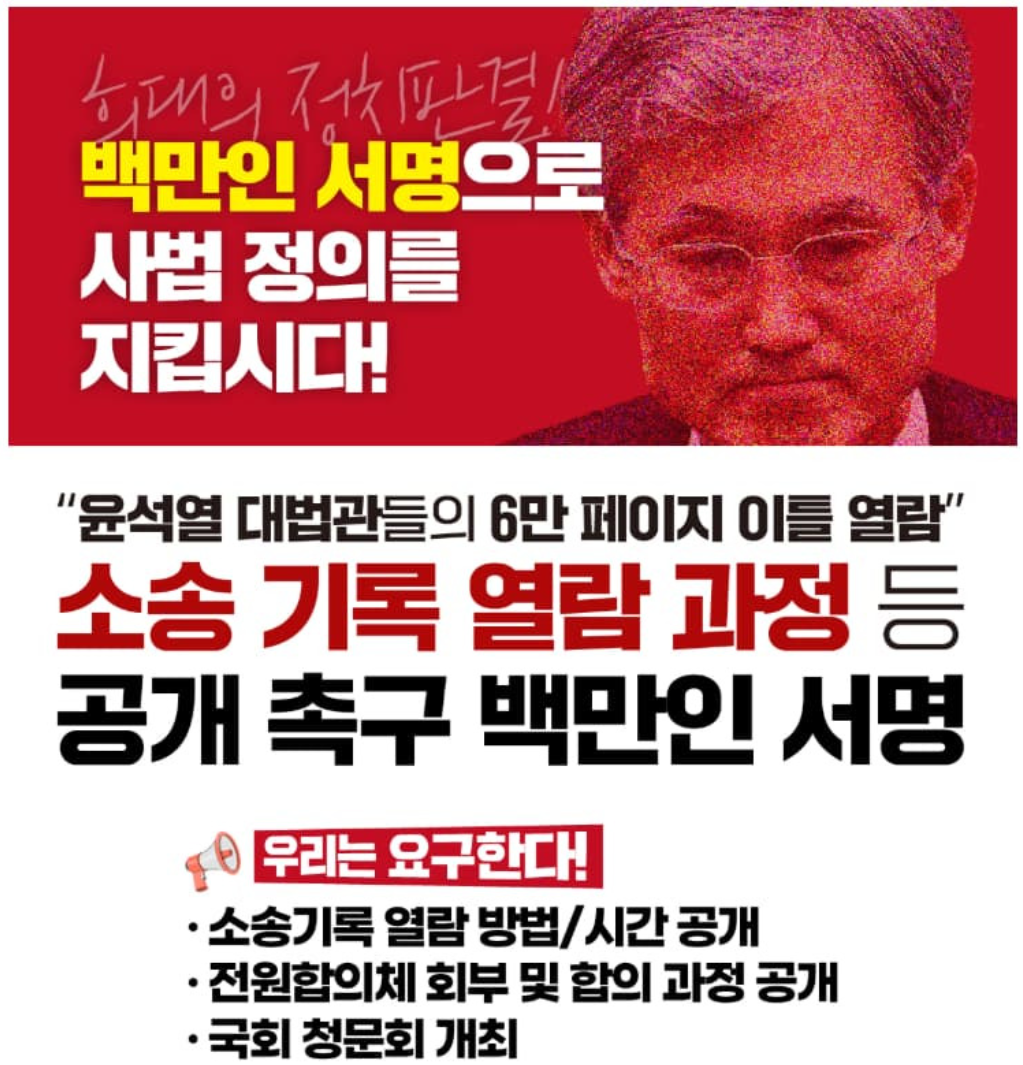 안녕하세요, 여러분!사법부의 투명성과 공정성을 높이기 위한 김민석 의원의 ‘법관 로그기록 공개 100만 서명운동’이 한창입니다.오늘은 누구나 간편하게 참여할 수 있는 온라인 서명 링크와 공식 정보공개 청구 두 가지 방법을 정리해 드릴게요.1. 온라인 서명 링크로 참여하기구글 폼 링크 접속: 법관 로그기록 공개 100만 서명하기 이름, 이메일 등 간단한 정보 입력제출 버튼 클릭!Tip. 김민석 의원은 SNS(페이스북·인스타그램)에도 해당 링크를 공유 중이니, 최신 링크는 의원님 계정도 확인해 보세요.김민석 의원 인스타그램 @mskim2030 인스타그램 방문하기 2. 공식 정보공개 청구로 참여하기포털 접속: https://portal.scourt.go.kr상단 메뉴에서 ‘정보공개 청구’ 선택사건번호(예: 2..