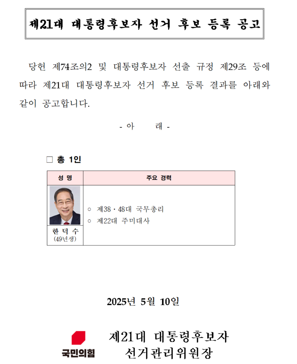 2025년 5월 10일, 국민의힘이 김문수 대통령 후보를 전격 교체하고 한덕수 예비후보를 등록한 사건은 사상 초유의 사례로 기록됩니다. 이 글에서는 국민의힘 대선 후보 교체의 배경, 절차, 당내외 반응과 향후 일정까지 상세히 정리합니다. 관련 키워드는