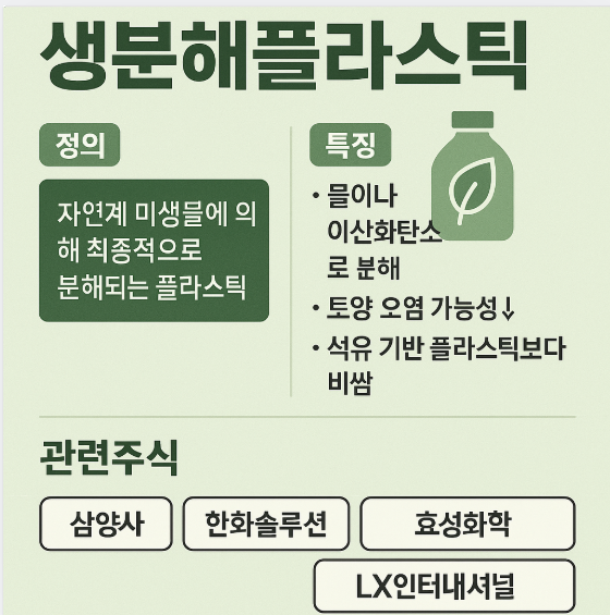생분해플라스틱은 환경오염 문제를 해결할 수 있는 혁신적인 소재로 주목받고 있습니다. 이 글에서는 생분해플라스틱의 정의, 주요 특징, 대표 소재, 그리고 관련주식까지 한눈에 정리해드립니다.
